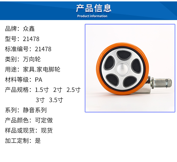 | 型号 | 21478 | 适用范围 | 家具.家电脚轮 | 规格 | 1.5寸,2寸,2.5寸,3寸,3.5寸 |