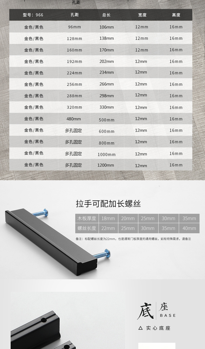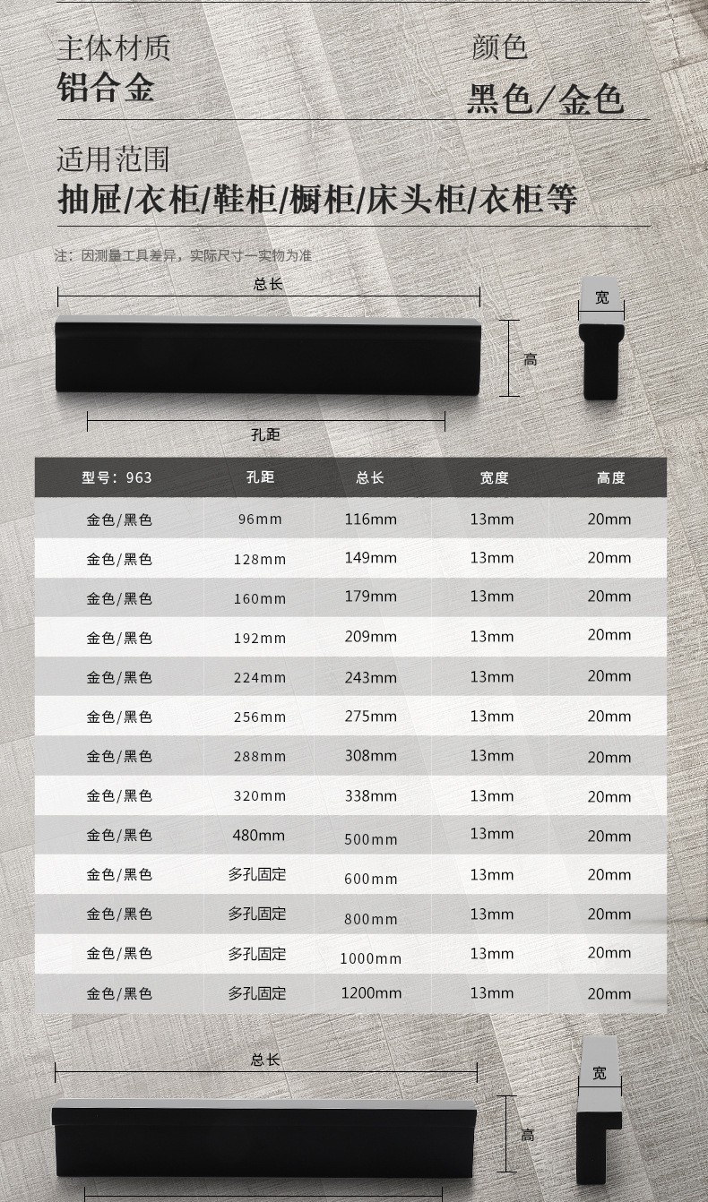 | 表面处理 | 抛光电镀 | 产品用途 | 柜门、橱柜、鞋柜、衣柜、抽屉 | 规格 | 亚黑963-96,亚黑963-128,亚黑963-160,亚黑963-192,亚黑963-224,亚黑963-256,亚黑963-288,亚黑963-320,亚黑963-500,亚黑963-600,亚 |