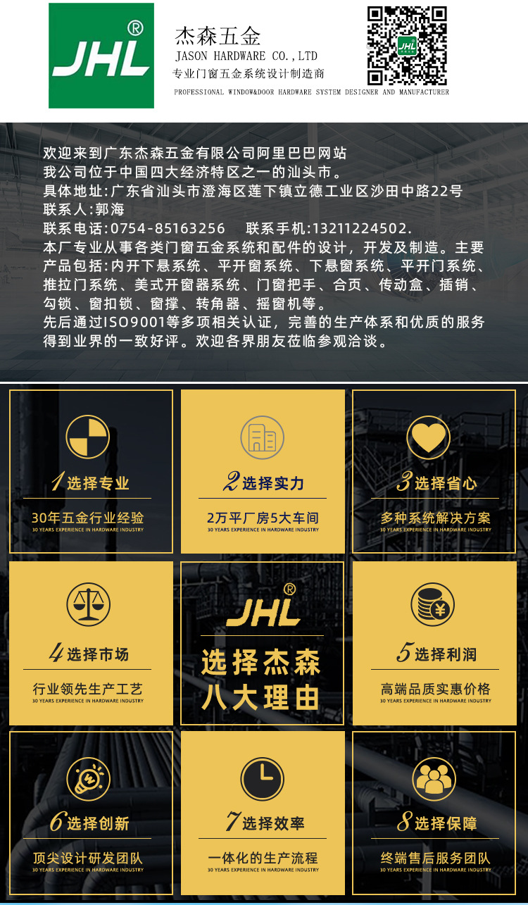 本厂从1994年开始从事门窗五金系统和配件的设计生产以及销售,并先后通过ISO9001等一系列质量管理体系认证。完善的生产体系和优质的服务水平得到业界的一致好平,欢迎各界朋友莅临参观洽谈。