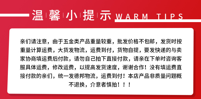 亲们请注意,由于五金类产品重量较重,批发价格不包邮,发货时按重量计算运费,大货