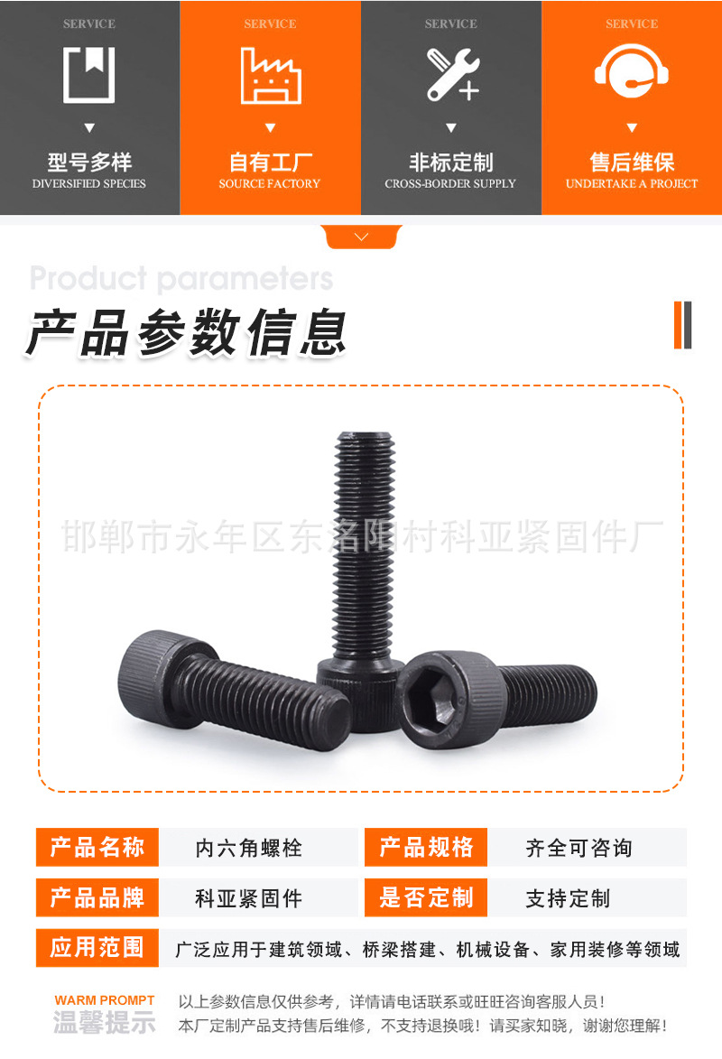 本网页所展示的有关【高强度内六角螺栓 圆柱头高强度螺丝10.9级内六角螺栓发黑螺钉_六角螺栓_邯郸市永年区东洺阳村科亚紧固件厂】的信息/图片/参数等由全球零部件网的会员【邯郸市永年区东洺阳村科亚紧固件厂】提供,由全球零部件网会员【邯郸市永年区东洺阳村科亚紧固件厂】自行对信息/图片/参数等的真实性、准确性和合法性负责,本平台(本网站)仅提供展示服务,请谨慎交易,因交易而产生的法律关系及法律纠纷由您自行协商解决,本平台(本网站)对此不承担任何责任。您在本网页可以浏览【高强度内六角螺栓 圆柱头高强度螺丝10.9级内六角螺栓发黑螺钉_六角螺栓_邯郸市永年区东洺阳村科亚紧固件厂】有关的信息/图片/价格等及提供【高强度内六角螺栓 圆柱头高强度螺丝10.9级内六角螺栓发黑螺钉_六角螺栓_邯郸市永年区东洺阳村科亚紧固件厂】的商家公司简介、开元kaiyuan(中国)等信息。