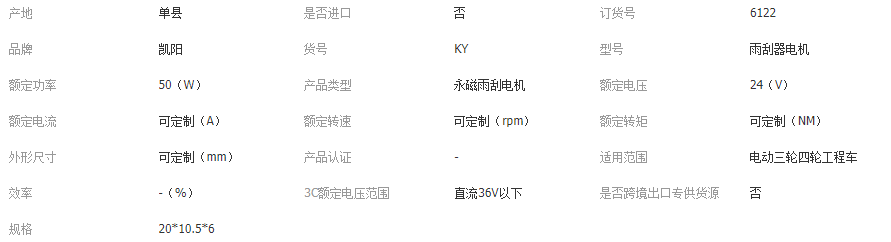 本网页所展示的有关【五线全铜电机工程车12V 24V雨刮电机永磁刮水电机驾驶楼雨刮电机_雨刷系统_单县凯阳电机制造厂】的信息/图片/参数等由全球零部件网的会员【单县凯阳电机制造厂】提供,由全球零部件网会员【单县凯阳电机制造厂】自行对信息/图片/参数等的真实性、准确性和合法性负责,本平台(本网站)仅提供展示服务,请谨慎交易,因交易而产生的法律关系及法律纠纷由您自行协商解决,本平台(本网站)对此不承担任何责任。您在本网页可以浏览【五线全铜电机工程车12V 24V雨刮电机永磁刮水电机驾驶楼雨刮电机_雨刷系统_单县凯阳电机制造厂】有关的信息/图片/价格等及提供【五线全铜电机工程车12V 24V雨刮电机永磁刮水电机驾驶楼雨刮电机_雨刷系统_单县凯阳电机制造厂】的商家公司简介、开元kaiyuan(中国)等信息。