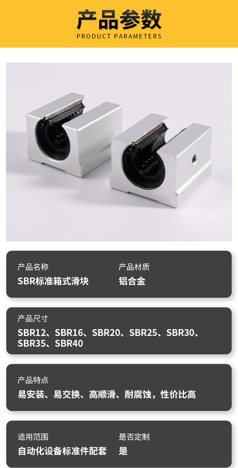 本网页所展示的有关【SBR标准箱式滑块直线性光轴承导向轨开口铝合金滑块_导轨_东莞市舜发轴承有限公司】的信息/图片/参数等由全球零部件网的会员【东莞市舜发轴承有限公司】提供,由全球零部件网会员【东莞市舜发轴承有限公司】自行对信息/图片/参数等的真实性、准确性和合法性负责,本平台(本网站)仅提供展示服务,请谨慎交易,因交易而产生的法律关系及法律纠纷由您自行协商解决,本平台(本网站)对此不承担任何责任。您在本网页可以浏览【SBR标准箱式滑块直线性光轴承导向轨开口铝合金滑块_导轨_东莞市舜发轴承有限公司】有关的信息/图片/价格等及提供【SBR标准箱式滑块直线性光轴承导向轨开口铝合金滑块_导轨_东莞市舜发轴承有限公司】的商家公司简介、开元kaiyuan(中国)等信息。
