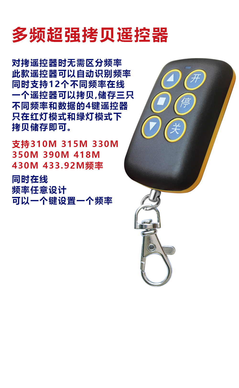本网页所展示的有关【通用全频万能对拷遥控器 多频拷贝电动车库门小区升降杆遥控钥匙_遥控IC_深圳市辰杰电子有限公司】的信息/图片/参数等由全球零部件网的会员【深圳市辰杰电子有限公司】提供,由全球零部件网会员【深圳市辰杰电子有限公司】自行对信息/图片/参数等的真实性、准确性和合法性负责,本平台(本网站)仅提供展示服务,请谨慎交易,因交易而产生的法律关系及法律纠纷由您自行协商解决,本平台(本网站)对此不承担任何责任。您在本网页可以浏览【通用全频万能对拷遥控器 多频拷贝电动车库门小区升降杆遥控钥匙_遥控IC_深圳市辰杰电子有限公司】有关的信息/图片/价格等及提供【通用全频万能对拷遥控器 多频拷贝电动车库门小区升降杆遥控钥匙_遥控IC_深圳市辰杰电子有限公司】的商家公司简介、开元kaiyuan(中国)等信息。