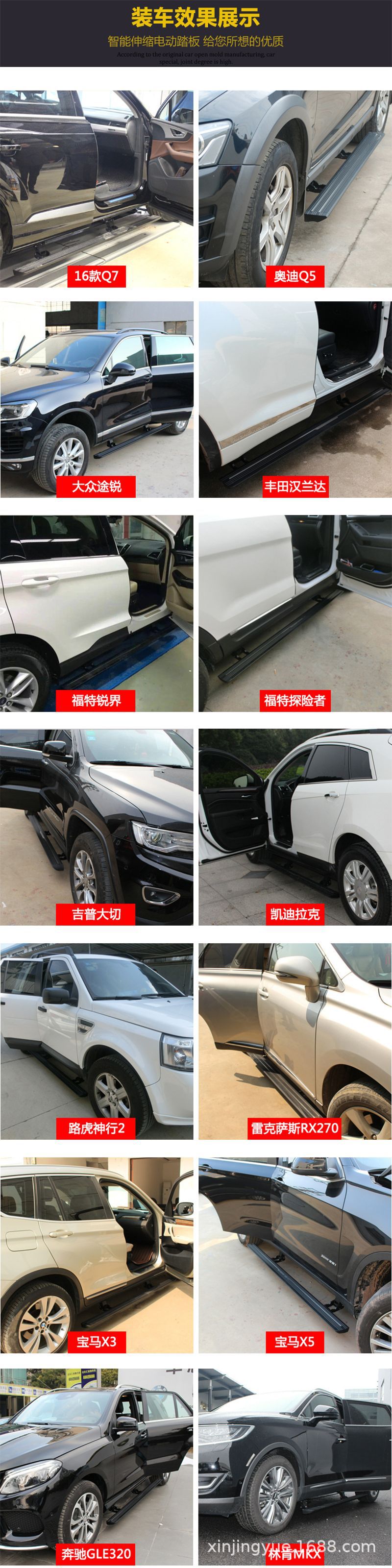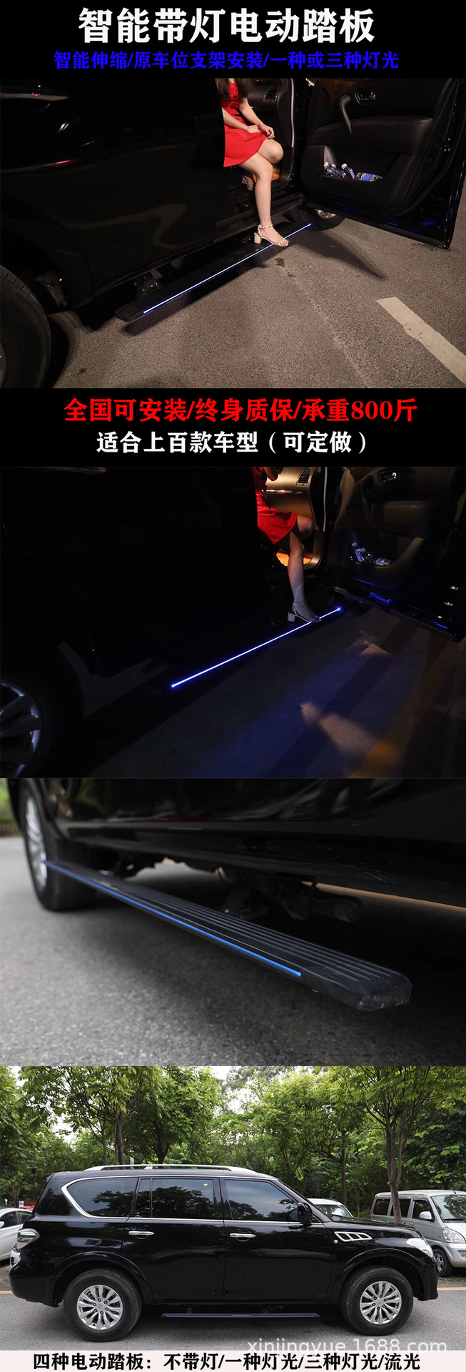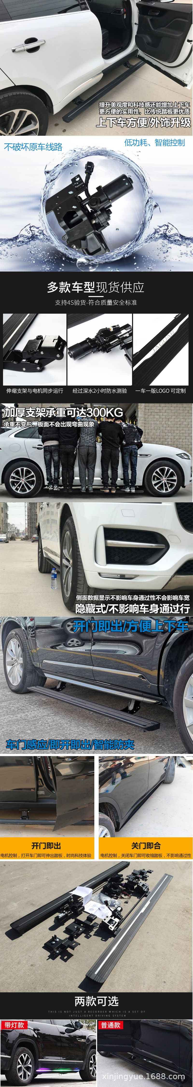 【产品优点及作用】:原车位磨具开发,超强承重800斤,加厚铝合金面板,原车LOGO,从材料到做工再到包装,用心精细。终身质保,反应灵敏,防水防夹静音免破线,无损安装,安全可靠,转车专用,高端大气,放心批售安装。欢迎各经销批发商和外贸电商合作!!!购买注意:2只为一整套,下单一套请拍2只,其它车型或者购买有疑问可联系客服。单价由低到高,依次分为第五代电动伸缩脚踏板、第六代带蓝光电动伸缩踏板、第六代七彩流光电动伸缩踏板,第六代手机APP控制带灯电动踏板和双面带灯电动踏板。不只是开门伸出方便上下车,关起收缩不影响车辆通过性;更是瞬间提升档次,美观大气。迎合车友们的喜爱。拥有上百款车型,持续开发中...更多车型可咨询客服!